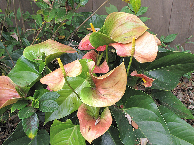 An exciting tropical plant producing glossy, pink and green heart shaped spathes that last for several weeks; each with a spadix that matures to yellow, covered in tiny flowers; large, dark green leathery leaves are great contrast; great for containers