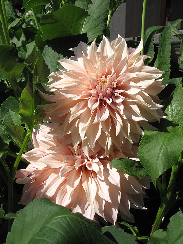 Cafe Au Lait Dahlia features showy fully double peach pincushion flowers with creamy white overtones at the ends of the stems from mid summer to mid fall. The flowers are excellent for cutting. Its pointy leaves remain green in colour throughout the season.