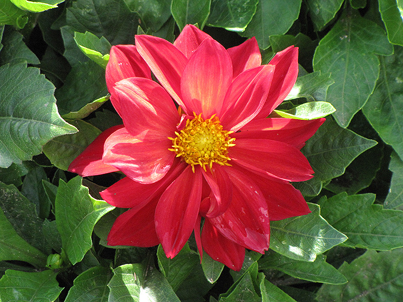 Dahlietta® Anna Dahlia features showy double scarlet daisy flowers with yellow eyes at the ends of the stems from early summer to mid fall. The flowers are excellent for cutting. Its serrated pointy leaves remain green in colour throughout the season.