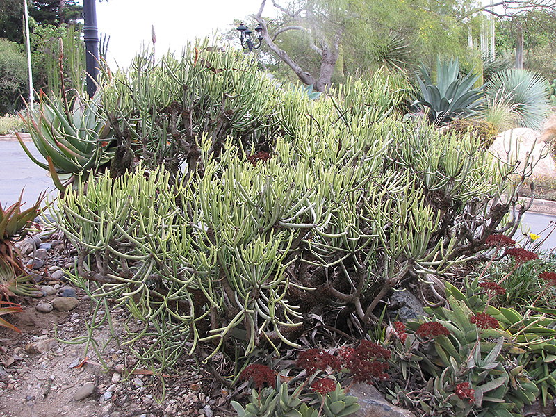An upright, leafless succulent that spreads slowly by suckering; small clusters of yellow flowers appear in late winter until summer at the end of bright green stems; an interesting plant for a dry sunny area