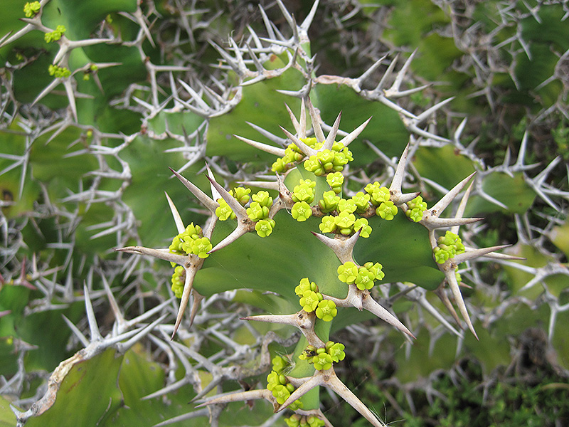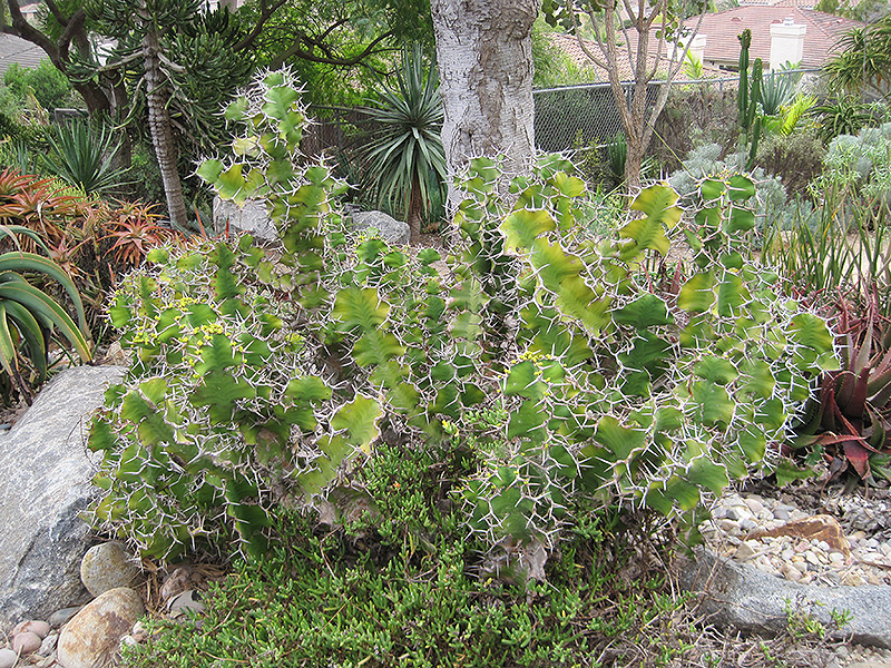 An extremely thorny, decorative variety with spines in the shape of cow horns; narrow green foliage atop cactus-like branches that store moisture; showy yellow flowers followed by purple fruits; adds a truly exotic dimension to the garden