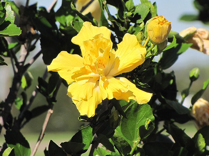 Crown Of Bohemia Hibiscus features bold double yellow round flowers with gold overtones and orange eyes at the ends of the branches from mid summer to early fall. Its glossy pointy leaves remain dark green in colour throughout the year.