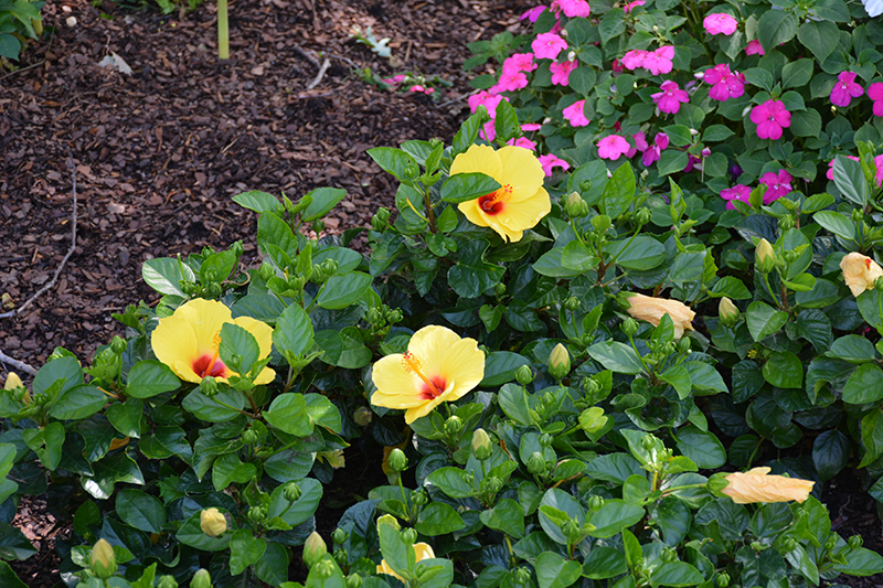 Sunny Wind Hibiscus features bold yellow round flowers with red eyes at the ends of the branches from mid summer to early fall. Its glossy pointy leaves remain dark green in colour throughout the year.