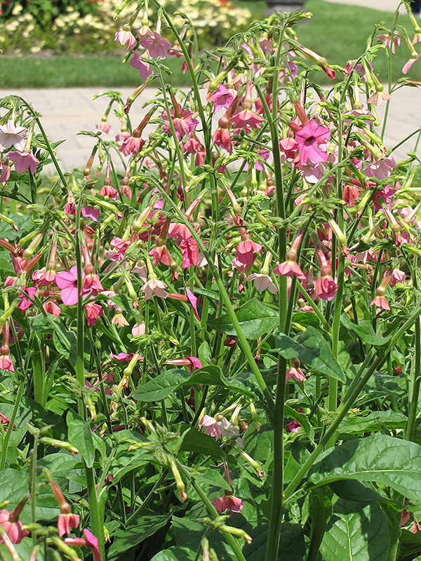 Whisper Rose Shades Flowering Tobacco will grow to be about 32 inches tall at maturity, with a spread of 18 inches. When grown in masses or used as a bedding plant, individual plants should be spaced approximately 14 inches apart. Its foliage tends to remain dense right to the ground, not requiring facer plants in front. Although it's not a true annual, this fast-growing plant can be expected to behave as an annual in our climate if left outdoors over the winter, usually needing replacement the following year. As such, gardeners should take into consideration that it will perform differently than it would in its native habitat.