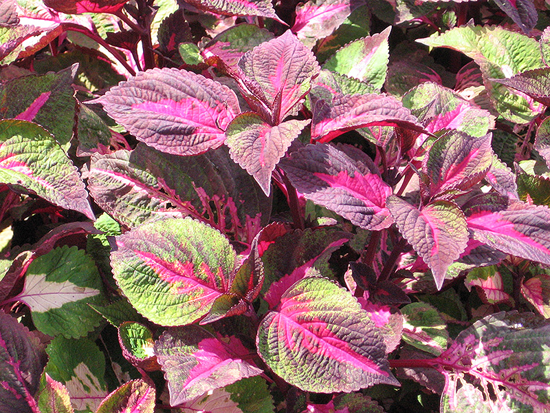 Light green new foliage quickly matures to deep plum-purple, with hot pink centers; a great garden accent or landscape plant that also works well in mixed containers; performs well in sun or shade