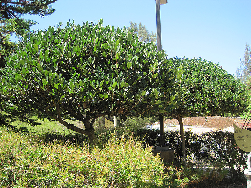 A large evergreen shrub or small tree that produces clusters of soft pink flowers in spring; bright reddish-orange new foliage matures to a deep glossy green; maroon winter foliage; an excellent accent tree, or screen; shown to be leaf spot resistant
