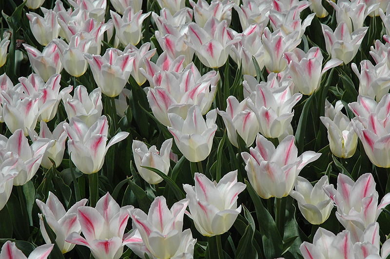 Holland Chic Tulip has masses of beautiful white cup-shaped flowers with pink overtones and hot pink streaks at the ends of the stems in mid spring, which are most effective when planted in groupings. The flowers are excellent for cutting. Its sword-like leaves remain green in colour throughout the season.