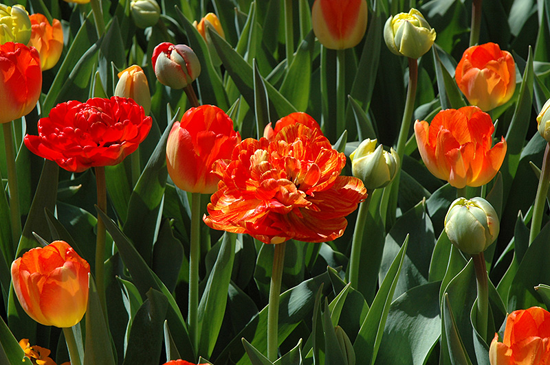Orange Fantasy Tulip has masses of beautiful double orange cup-shaped flowers with scarlet overtones and gold streaks at the ends of the stems in late spring, which are most effective when planted in groupings. The flowers are excellent for cutting. Its sword-like leaves remain grayish green in colour throughout the season.