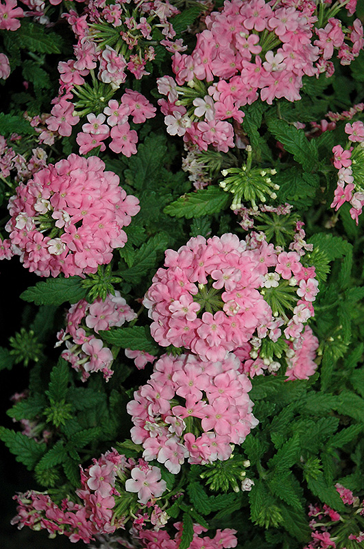 Lindolena Pink Verbena features showy clusters of pink star-shaped flowers with creamy white overtones at the ends of the stems from late spring to mid fall. The flowers are excellent for cutting. Its tiny tomentose narrow leaves remain green in colour throughout the season.