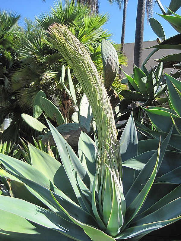 An appealing variety producing a rosette of wide, powder blue foliage on smooth gray stems that can reach 4 feet; infrequent flower stalks curve toward the ground, then arch back upward, resembling a fox's tail; a great accent planting