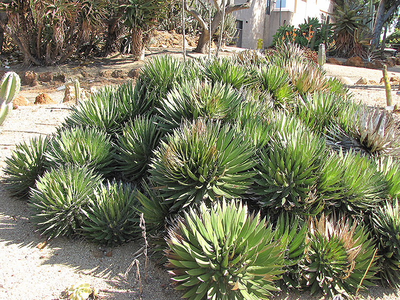 Clumping, dense rosettes of green, sword-like leaves that are covered with white threads; towering spikes with greenish-brown flowers when rosettes mature; a great visual accent for rockeries or dry gardens