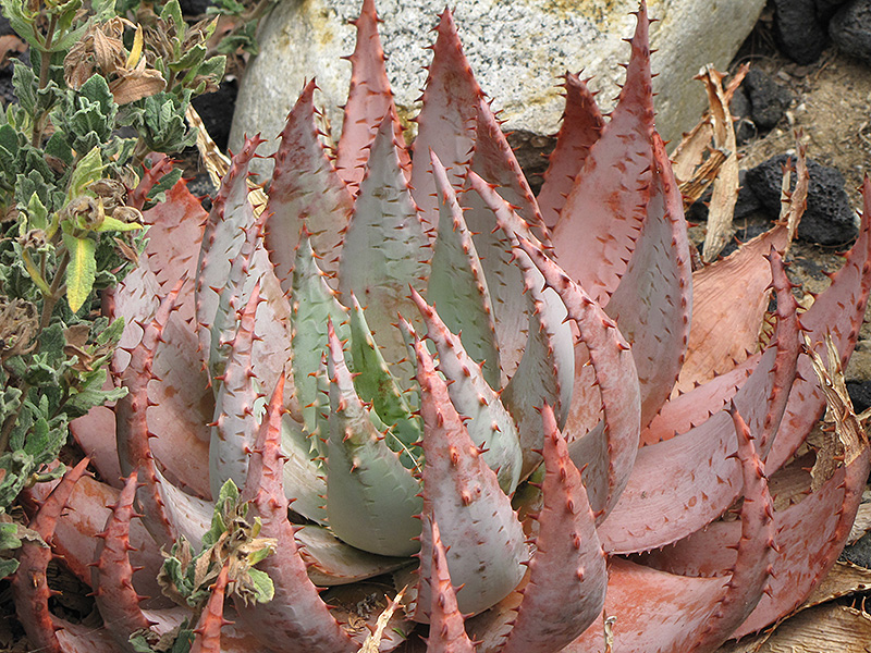 A beautiful stemless variety with glaucous, spiny leaves that are severely incurved, creating a spherical rosette; produces a thick, bold spike of orangy-red flowers in winter; a wonderful garden or container accent
