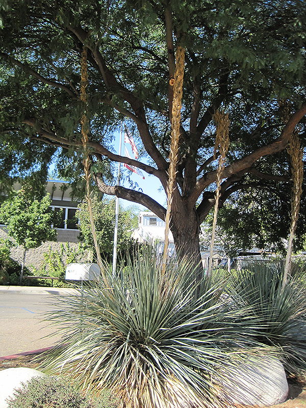 Desert Spoon will grow to be about 5 feet tall at maturity extending to 15 feet tall with the flowers, with a spread of 5 feet. It tends to fill out right to the ground and therefore doesn't necessarily require facer plants in front, and is suitable for planting under power lines. It grows at a slow rate, and under ideal conditions can be expected to live for 40 years or more.