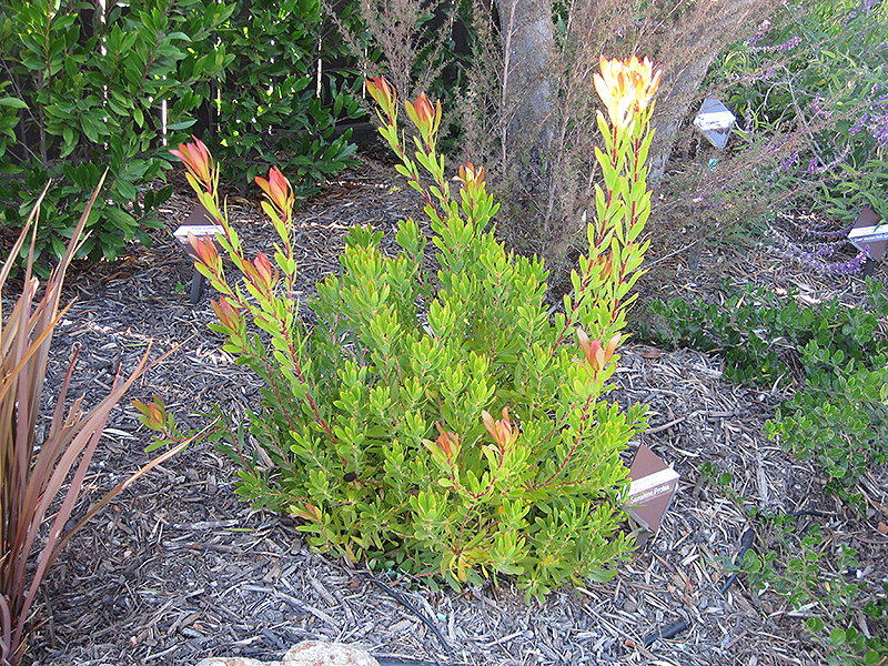 This flowering shrub, in the Protea family, has amazing red bracts surrounding vivid yellow centers, and reddish tips on the leaves; an interesting, upswept habit that is well branched; avoid phosphorus fertilizers