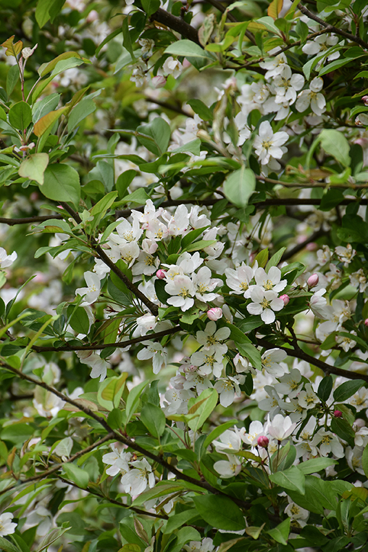 Winter Gold Flowering Crab is blanketed in stunning clusters of fragrant white flowers along the branches in mid spring, which emerge from distinctive crimson flower buds before the leaves. The fruits are showy gold pomes carried in abundance from early fall to late winter. It has dark green deciduous foliage. The pointy leaves turn yellow in fall.
