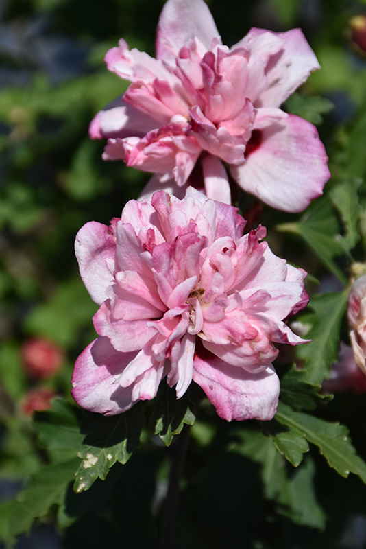 Peppermint Smoothie Rose of Sharon features bold double shell pink round flowers with dark red eyes and red streaks along the branches from mid summer to early fall. It has green deciduous foliage. The lobed leaves do not develop any appreciable fall colour.