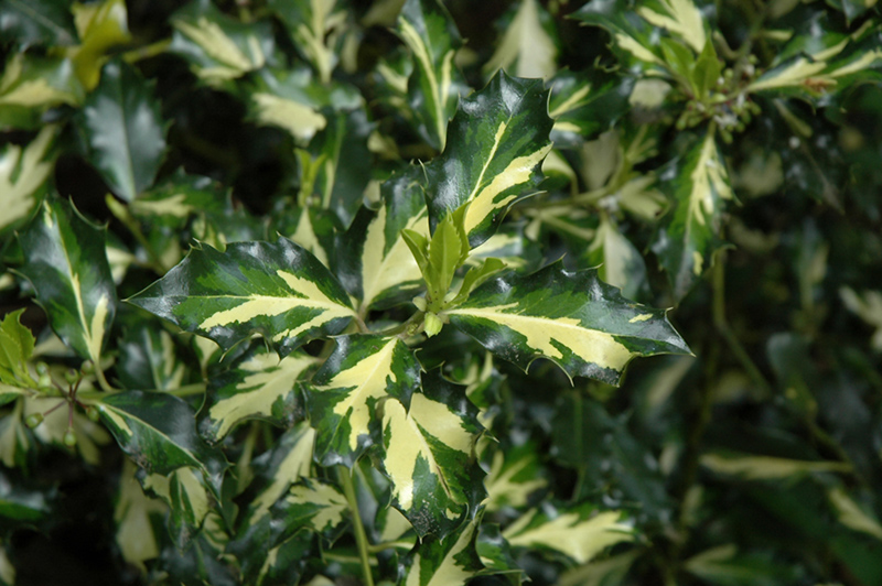 This stunning cultivar is valued for its attractive, glossy dark green foliage with striking cream variegation that makes it really stand out; pretty red berries in winter; requires moist to wet highly acidic soil