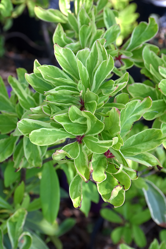Wonderful white-variegated evergreen foliage turns pink in cooler fall and winter weather; produces star-shaped seeds similar to the culinary anise, but toxic; spidery red flowers appear in spring; a showy landscape accent plant