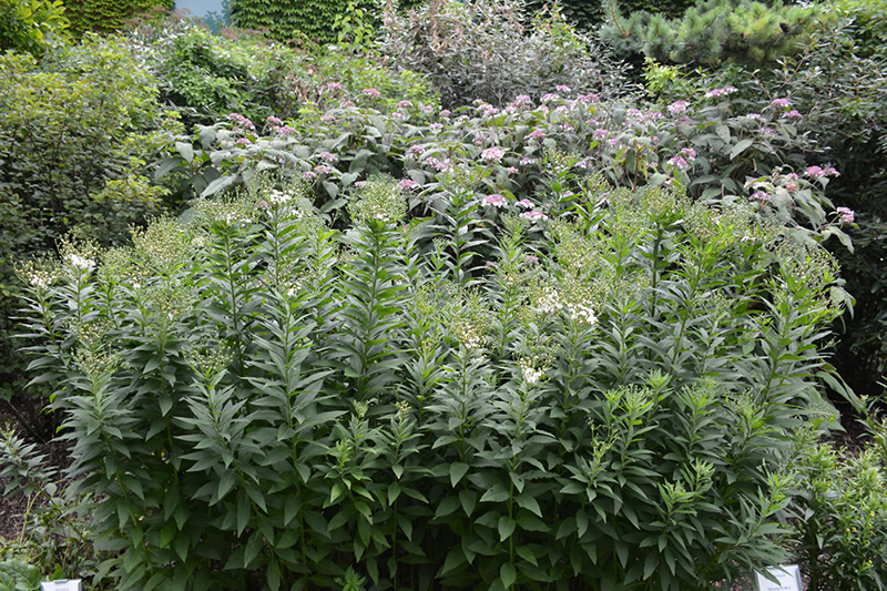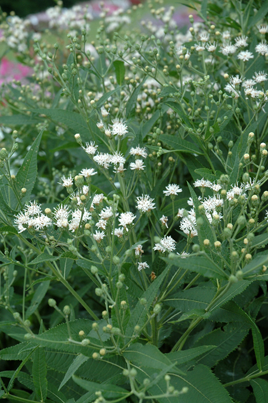 White Lightning Ironweed will grow to be about 4 feet tall at maturity extending to 6 feet tall with the flowers, with a spread of 4 feet. When grown in masses or used as a bedding plant, individual plants should be spaced approximately 3 feet apart. Its foliage tends to remain dense right to the ground, not requiring facer plants in front. It grows at a fast rate, and under ideal conditions can be expected to live for approximately 10 years. As an herbaceous perennial, this plant will usually die back to the crown each winter, and will regrow from the base each spring. Be careful not to disturb the crown in late winter when it may not be readily seen!