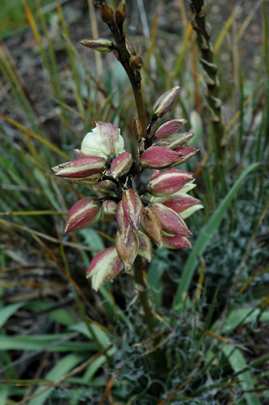 Harriman's Yucca features bold spikes of creamy white bell-shaped flowers with lavender streaks rising above the foliage from mid to late summer, which emerge from distinctive brick red flower buds. It has attractive green evergreen foliage. The sword-like leaves are highly ornamental and remain green throughout the winter.