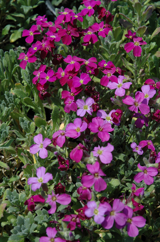 Cascade Red Rock Cress is smothered in stunning crimson cup-shaped flowers with violet overtones at the ends of the stems from mid spring to early summer. Its small tomentose round leaves remain grayish green in colour throughout the year.
