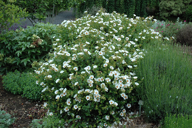 Bicolor Rockrose is smothered in stunning white round flowers with gold eyes and burgundy spots at the ends of the branches from late spring to late summer. It has attractive dark green foliage with grayish green undersides. The fuzzy narrow leaves are highly ornamental and remain dark green throughout the winter.