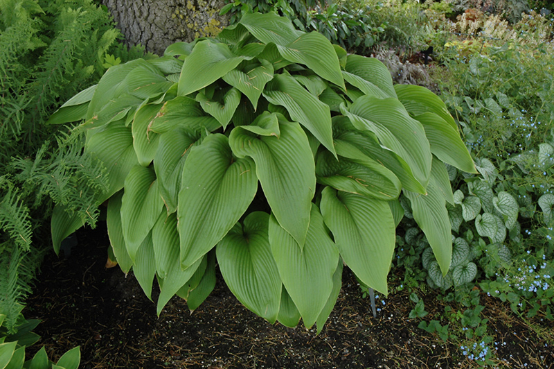 This variety has glossy, ridged, light green leaves that cascade from a large mound; provides beautiful texture and contrast to other plants; lavender spikes of flowers on tall scapes in mid-summer