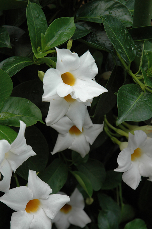 Summer Romance Bush White Mandevilla features bold white tubular flowers with gold throats along the stems from late spring to mid fall. Its glossy pointy leaves emerge light green in spring, turning dark green in colour the rest of the year.