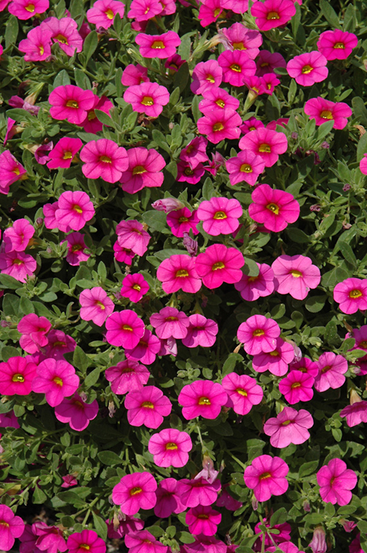 Kabloom™ Deep Pink Calibrachoa is draped in stunning hot pink trumpet-shaped flowers with yellow throats at the ends of the stems from late spring to early fall. Its small pointy leaves remain green in colour throughout the season.