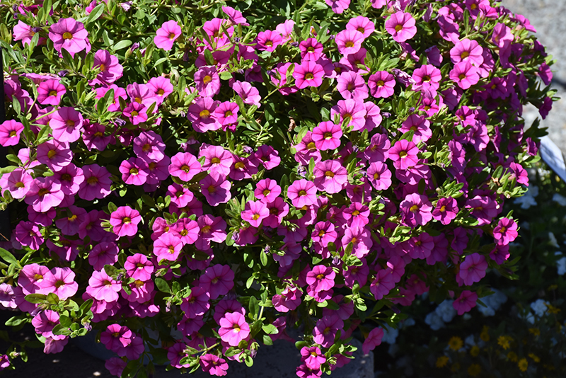 MiniFamous® Neo Pink Calibrachoa is smothered in stunning pink trumpet-shaped flowers with yellow throats at the ends of the stems from late spring to early fall. Its small pointy leaves remain green in colour throughout the season.