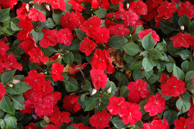 Lollipop Cherry Red Impatiens will grow to be about 11 inches tall at maturity, with a spread of 14 inches. When grown in masses or used as a bedding plant, individual plants should be spaced approximately 12 inches apart. Its foliage tends to remain low and dense right to the ground. This fast-growing annual will normally live for one full growing season, needing replacement the following year.