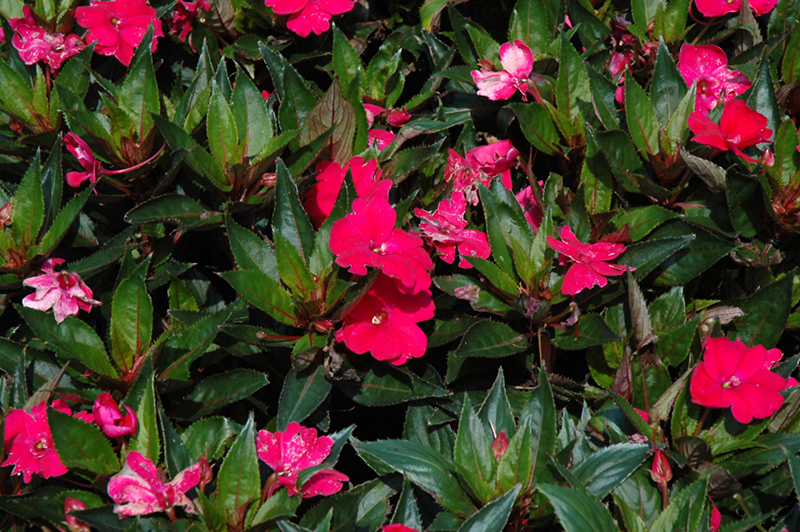 Sun Harmony™ Deep Pink New Guinea Impatiens features bold hot pink round flowers at the ends of the stems from mid spring to early fall. Its pointy leaves remain dark green in colour throughout the season.