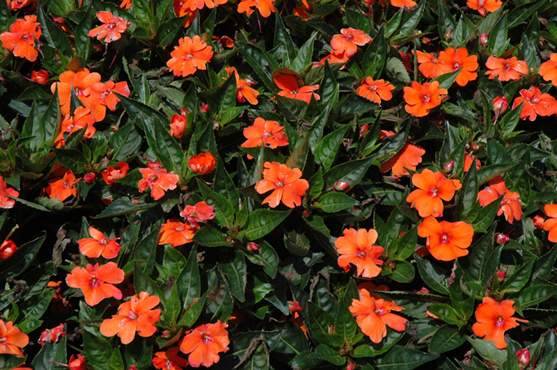Sun Harmony™ Orange New Guinea Impatiens features bold orange round flowers with scarlet overtones at the ends of the stems from mid spring to early fall. Its pointy leaves remain dark green in colour throughout the season.