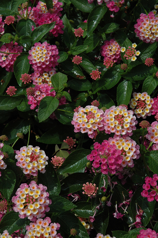 Evita Pink Lantana features showy cymes of pink flowers with creamy white overtones at the ends of the branches from early summer to mid fall. Its glossy pointy leaves remain dark green in colour throughout the year.
