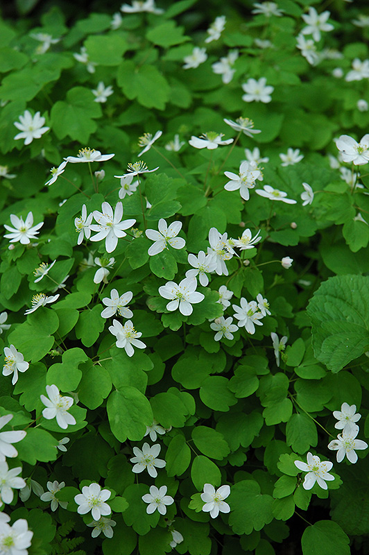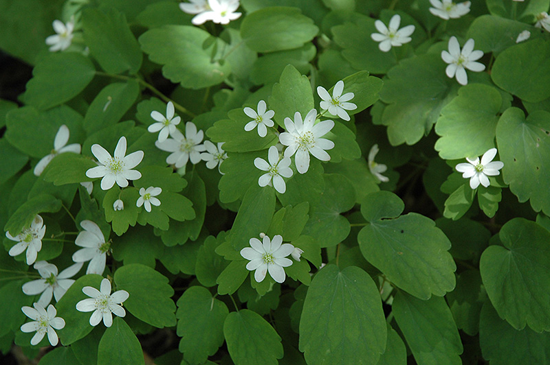 Rue Anemone will grow to be only 6 inches tall at maturity, with a spread of 8 inches. Its foliage tends to remain low and dense right to the ground. It grows at a medium rate, and under ideal conditions can be expected to live for approximately 5 years. As an herbaceous perennial, this plant will usually die back to the crown each winter, and will regrow from the base each spring. Be careful not to disturb the crown in late winter when it may not be readily seen!