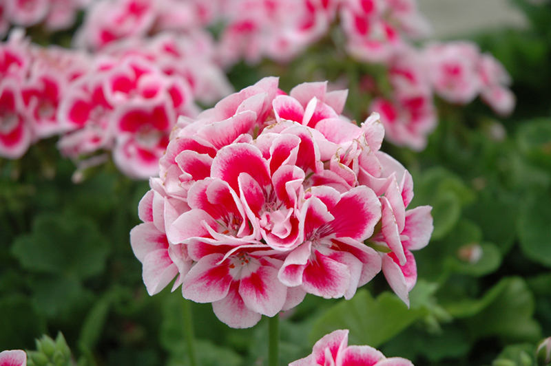 Elanos White Splash Geranium is an herbaceous annual with an upright spreading habit of growth. Its medium texture blends into the garden, but can always be balanced by a couple of finer or coarser plants for an effective composition.
