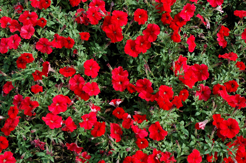 Trilogy Red Petunia will grow to be about 14 inches tall at maturity, with a spread of 30 inches. When grown in masses or used as a bedding plant, individual plants should be spaced approximately 24 inches apart. Its foliage tends to remain dense right to the ground, not requiring facer plants in front. This fast-growing annual will normally live for one full growing season, needing replacement the following year.