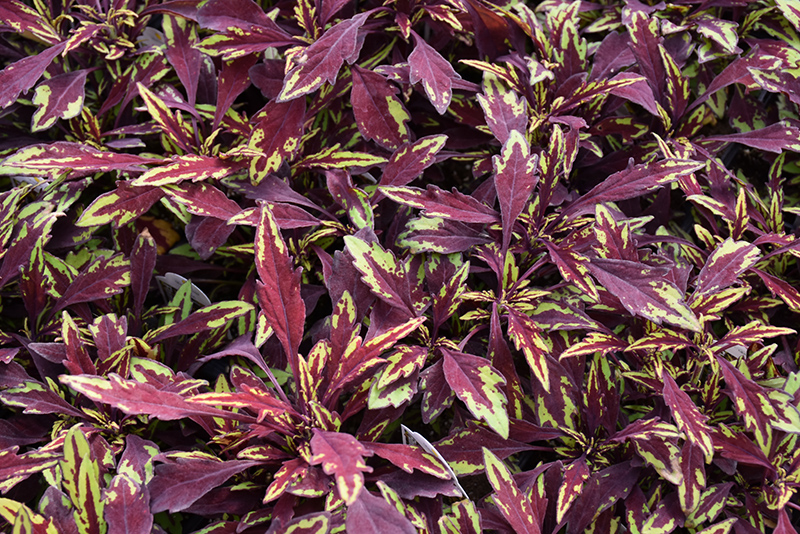FlameThrower Chipotle Coleus' attractive serrated pointy leaves remain burgundy in colour with distinctive lime green edges throughout the year on a plant with a mounded habit of growth.