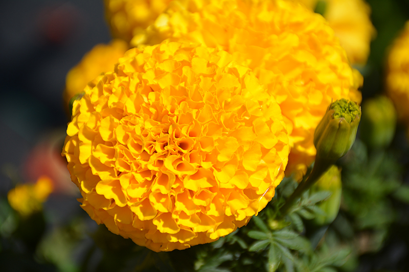 Taishan Gold Marigold features bold fully double gold ball-shaped flowers with buttery yellow eyes at the ends of the stems from early summer to mid fall. The flowers are excellent for cutting. Its fragrant ferny leaves remain dark green in colour throughout the season.