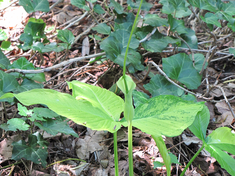 An interesting shade groundcover producing deeply lobed lime green leaves that are splashed with yellow; green and yellow flowers, similar to jack-in-the-pulpits, have tall whips rising from the tops, and bloom all summer; a great woodland groundcover