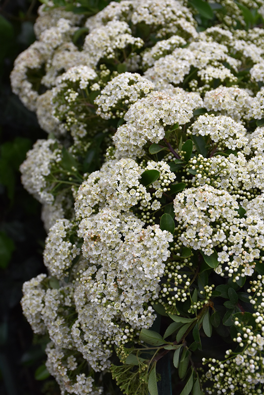 Mohave Firethorn features showy clusters of white flowers held atop the branches in late spring. It has dark green evergreen foliage. The glossy oval leaves turn coppery-bronze in the fall, which persists throughout the winter.