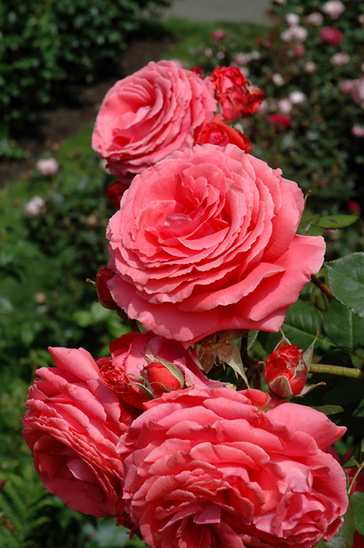 America Rose features showy fragrant double salmon flowers with pink overtones along the branches from late spring to mid fall, which emerge from distinctive scarlet flower buds. The flowers are excellent for cutting. It has green deciduous foliage. The glossy oval compound leaves do not develop any appreciable fall colour.