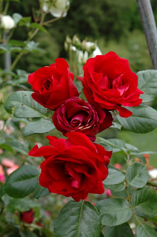 Crimson Sky Rose features showy lightly-scented double crimson flowers along the branches from late spring to late summer. The flowers are excellent for cutting. It has dark green deciduous foliage. The glossy oval compound leaves do not develop any appreciable fall colour.