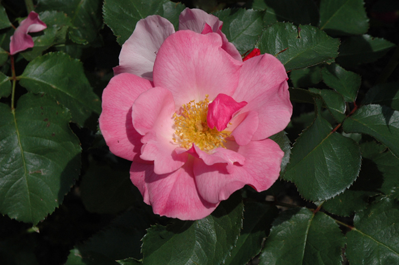 Bushy and upright in form, this floribunda rose produces lovely pink single blooms with golden centers; a tremendous visual impact when massed in the garden; an extraordinary cut flower; beautiful deep green foliage that is moderately disease resistant