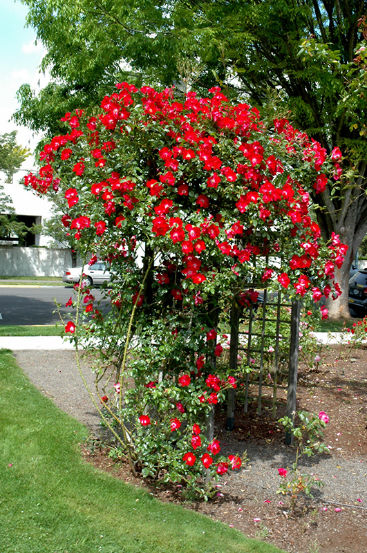 A vigorous climber that produces spectacular clusters of red single blooms with white eyes and gold stamens; moderate fragrance; perfect for garden walls and trellises; prune this variety after blooming