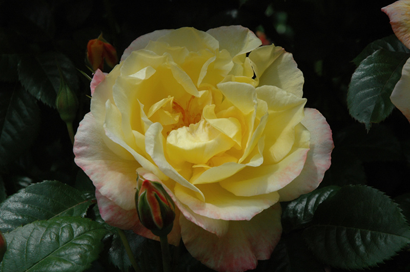 Moonlight Rose features showy clusters of fragrant semi-double yellow flowers with gold eyes and pink edges along the branches from late spring to late summer. The flowers are excellent for cutting. It has dark green deciduous foliage. The glossy oval compound leaves do not develop any appreciable fall colour.
