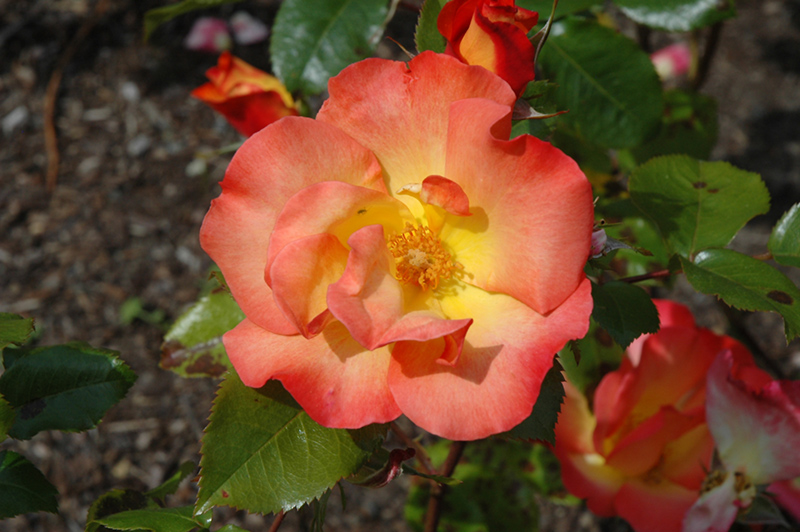 Bushy and upright in form, this variety produces glowing orange-yellow semi-double blooms with red petal edges; mild apple fragrance; creates tremendous visual impact when massed in the garden; blooms in flushes all season long