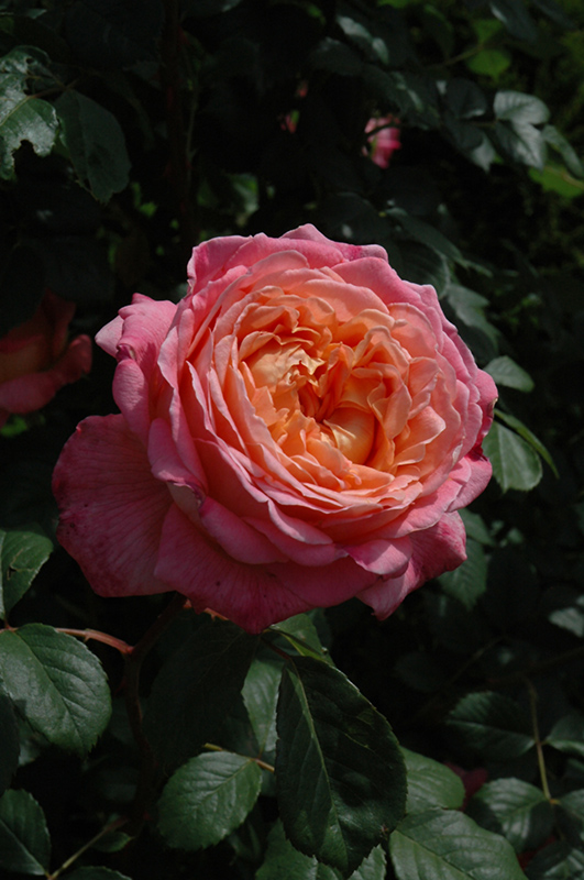 Portlandia Rose features showy lightly-scented fully double pink flowers with gold eyes and peach centers at the ends of the branches from late spring to early fall. The flowers are excellent for cutting. It has dark green deciduous foliage. The oval compound leaves do not develop any appreciable fall colour.