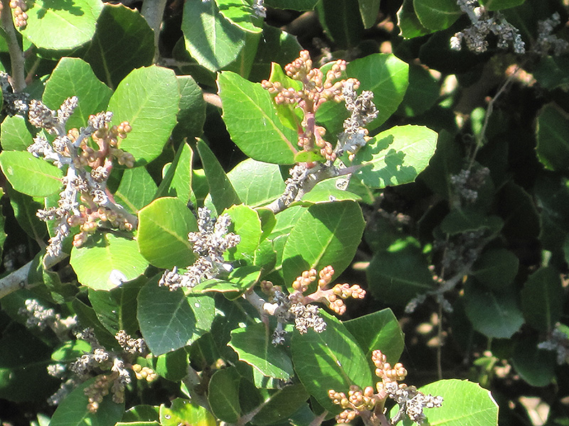 An evergreen shrub that is great as a rock garden accent plant or screen; an attractive plant for dry situations; leathery dark green leaves contrast the gray bark; a great water conservation shrub