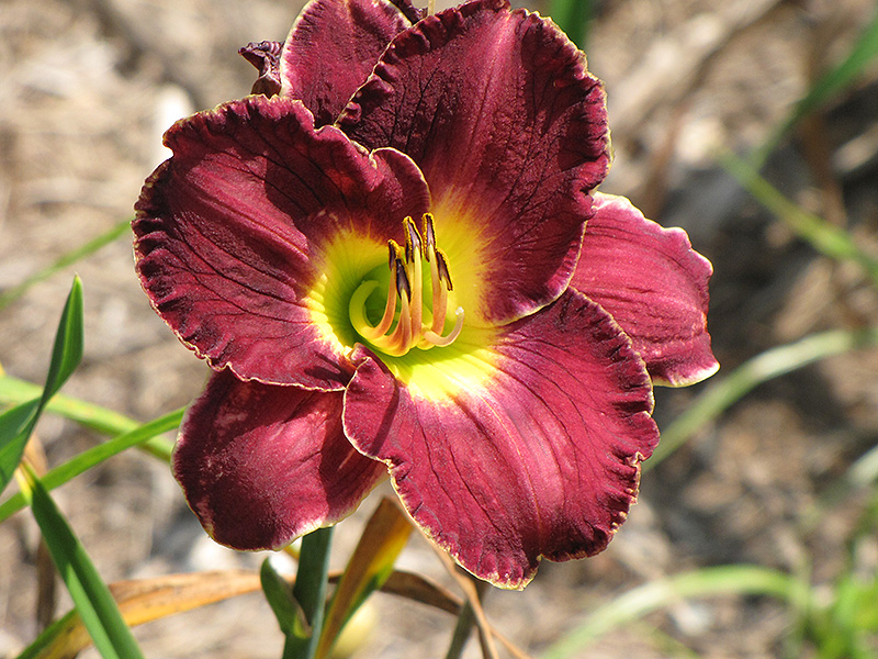 Deep reddish-purple trumpets with yellow centers and creamy ruffled edges; great grassy texture and form; tetraploid; easy to grow and maintain; a showy addition to the garden or border